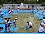 6月を前に、いよいよ水泳の季節が近づいてきました。その準備として、5・6年生がプール清掃を行いました。プールの底にたまった落ち葉や砂を集めたり、こびりついた汚れをブラシでこすったりと、力のいる作業もたくさんありましたが、友だちと声を掛け合いながら、協力して一生懸命に掃除をしてくれました。作業が終わるころには、プールはすっかりきれいになり、水を入れる準備もばっちりです。