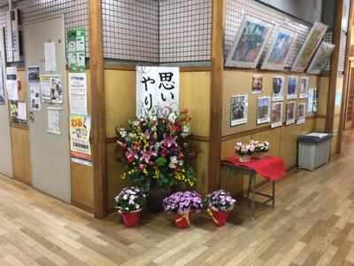 3月21日 校長室前の「思いやり」の掲示が、たくさんの花々に包まれています。